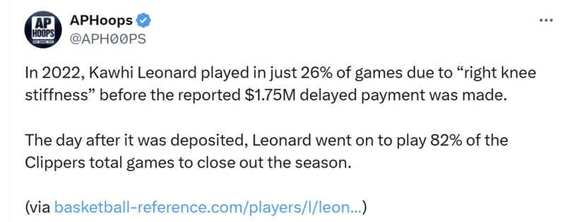 2022年,伦纳德因为“右膝僵硬”只打了球队26%的比赛,随后据报道收到了一笔延迟支付的175万美元。